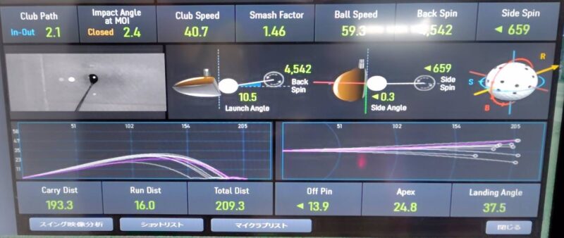 打ち出し角度10.5度、初速59.3m/s、キャリー193.3ヤード。ちょっと打ち出しが低すぎですね。