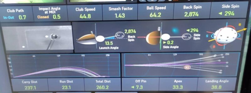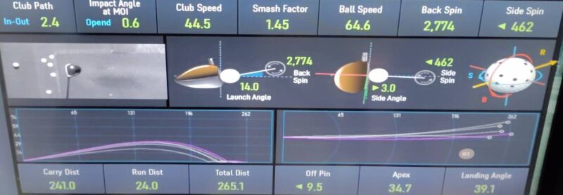 打ち出し角度13.5度、初速64.2m/s、キャリー237.1ヤード…1打目との違いは打ち出し角が低いことですね。私の初速ですと打ち出し角度が足りてなかったということだと思います。