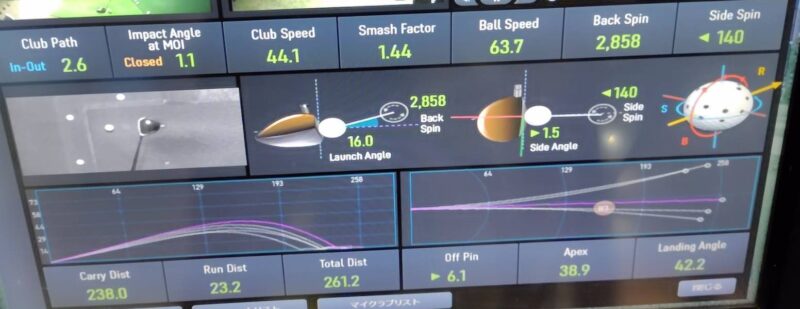 打ち出し角度16度、初速63.7m/s、キャリー238ヤード、ほぼまっすぐの弾道です。