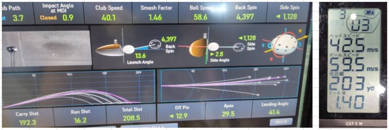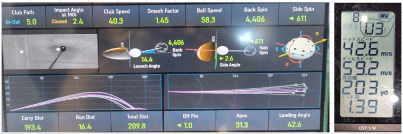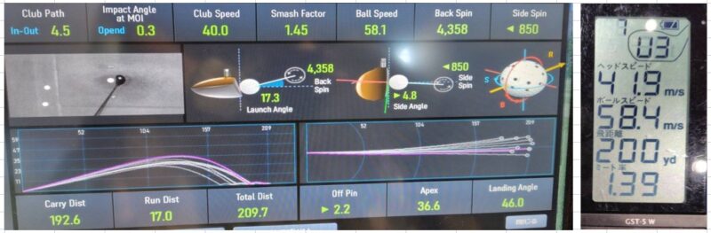 打ち出し角度17.3度、初速58.1m/s、キャリー192.6ヤード スピン量4,358 最高到達高さ36.6ヤード。