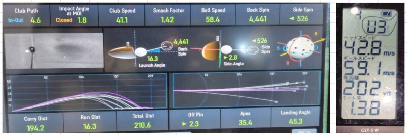 打ち出し角度16.3度、初速58.4m/s、キャリー194.2ヤード スピン量4,441 最高到達高さ35.4ヤード。