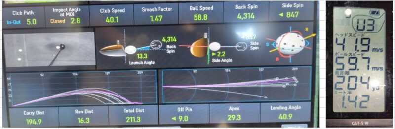 打ち出し角度13.3度、初速58.8m/s、キャリー194.9ヤード スピン量4,314 最高到達高さ29.3ヤード。