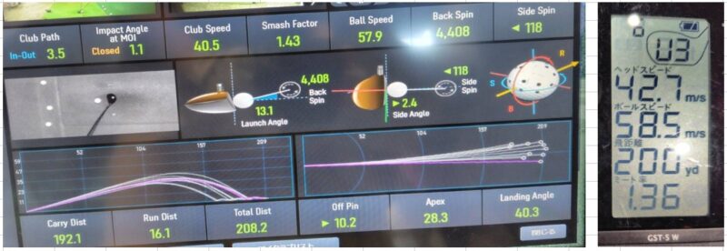 打ち出し角度13.1度、初速57.9m/s、キャリー192.1ヤード スピン量4,408 最高到達高さ28.3ヤード。