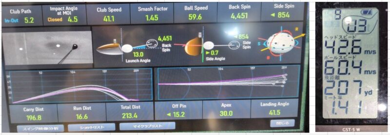 打ち出し角度13.0度、初速59.6m/s、キャリー196.8ヤード スピン量4,451 最高到達高さ30.0ヤード。やはり打ち出しから左に行くのはNGという意識で練習しないといけませんね。
